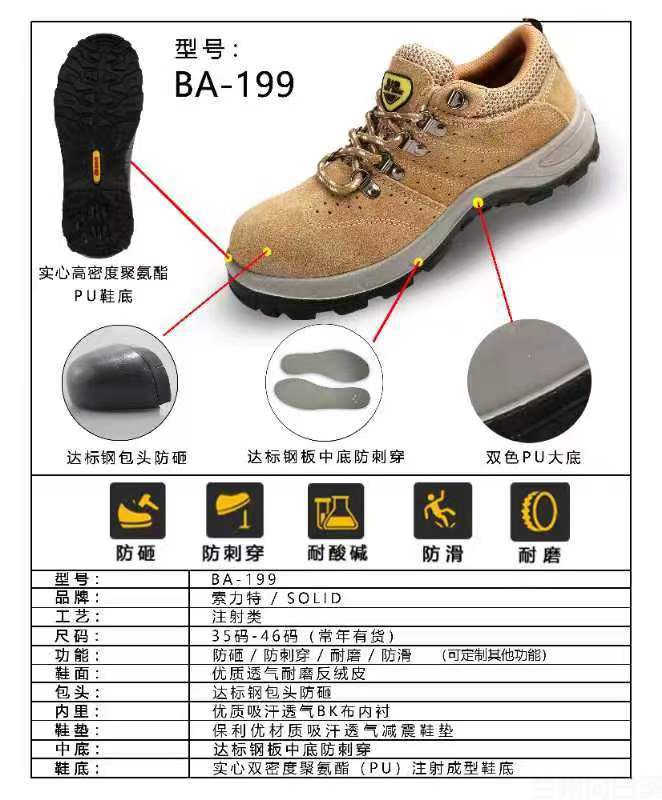 索力特BA-199防砸防刺穿耐磨优质透气反绒皮劳保鞋LBX23078500