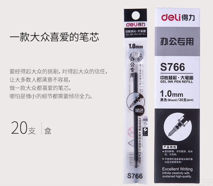得力(deli)S766黑 中性笔芯1.0mm子弹头(黑)DL23080090